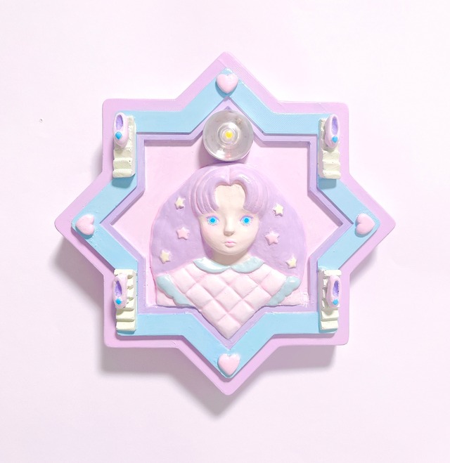 サイズ W×H18cm D3cm 星のフレームに、少し不思議な気配をまとった女の子のウォールランプです。こちらはピンクの髪色の女の子です。 星のフレームが結界のように女の子を囲い、内側に秘められた小さな世界を際立たせます。 無垢でありながら危うく制御不能な存在としての「女の子」という像をフレームの中に閉じ込めています。 このウォール・ランプはエディション上限3として制作・販売を予定してします。 同一の型を使用していますが、レジンキャストにすべて手作業で塗装を施している為、仕上がりが一点一点異なります。 単三電池2本使います。裏面の電池ボックスに付いているスイッチで点灯します。はじめにテスト用の電池を入れております。 size W×H18cm D3cm This wall lamp features a girl with a slightly mysterious aura within a star frame. In this piece, we retained the aura from the previous design, but restructured it to feature only the girl's figure. An eight-pointed star frame encloses the girl like a barrier, highlighting the small world hidden within the star. (※This wall lamp is planned for production and sale as a limited edition of 3. While the same mold is used, each piece is hand-painted, resulting in unique finishes for every item.) ※Due to changes in customs regulations, sales to the United States are currently suspended.